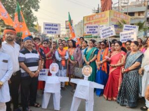 बिलासपुर (08 मई 2023 ) [तपन गोस्वामी द्वारा ] छत्तीसगढ़ में विगत 4 वर्षों से भूपेश बघेल की सरकार दो हजार करोड़ के शराब घोटाला किया है। ईडी की जांच में यह मामला उजागर हुआ है। इस संबंध में ईडी ने प्रेस विज्ञप्ति जारी कर भी घोटाले की बात कहीं। शराब घोटाला उजागर होने पर पूरे प्रदेश के संभागीय मुख्यालय में भारतीय जनता पार्टी महिला मोर्चा द्वारा जंगी प्रदर्शन किया गया। इसी के तहत आज बिलासपुर भाजपा महिला मोर्चा द्वारा मुख्यालय में एक विशाल रैली निकालकर डॉ श्यामा प्रसाद मुखर्जी चौक पुराना बस स्टैंड चौराहे में मुख्यमंत्री भूपेश बघेल एवं आबकारी मंत्री कवासी लखमा के पुतले का दहन किया गया। पुलिस द्वारा पुतले छीलने का जबरदस्त प्रयास किया गया परंतु वह सफल नहीं हो पाए। पुतला दहन के बाद महिला मोर्चा की प्रदेश मंत्री पुनीता डेहरिया ने अपने संक्षिप्त भाषण में कहा की भूपेश बघेल की सरकार जब से आई है तब से प्रदेश में घोटाला, लूटमार, हत्या की घटना, अपहरण, बलात्कार की घटनाओं में बेतहाशा वृद्धि हुई है। शराब घोटाले के मामले में तो भूपेश सरकार ने सारे रिकॉर्ड तोड़ दिए। अभी तक ईडी ने 2 हजार करोड़ रुपए के शराब घोटाले में गिरफ्तारियां की हैं अभी मामला और भी बढ़ेगा। भारतीय जनता पार्टी महिला मोर्चा की जिलाध्यक्ष जयश्री चौकसे ने अपने उद्बोधन में कहा कि कांग्रेस सरकार में भ्रष्टाचार चरण में हैं और आगे एक नया कीर्तिमान स्थापित करेगा। अपने घोषणापत्र में शराबबंदी लागू करने वाली सरकार खुद शराब की बिक्री और एवं साथ में घोटाले को बढ़ावा दिया है। भाजपा महिला मोर्चे के नेत्रियों ने कहा कि भूपेश बघेल सत्ता में बैठने का अपना नैतिक अधिकार खो चुके हैं इस कारण उन्हें इस्तीफा दे देना चाहिए। महिला मोर्चा की जिला महामंत्री गायत्री साहू ने शराब में नकली होलोग्राम का मामला उठाया। पुतला दहन कार्यक्रम में प्रदेश के पूर्व नेता प्रतिपक्ष धरमलाल कौशिक, बीजेपी प्रदेश उपाध्यक्ष भूपेंद्र शवन्नी, बेलसरा विधायक रजनीश सिंह, भाजपा जिला अध्यक्ष रामदेव कुमावत, भाजपा जिला उपाध्यक्ष किशोर राय, भाजपा जिला महामंत्री मोहित जयसवाल, जिला मंत्री अवधेश अग्रवाल, रामू साहू, एस कुमार मनहर, युवा मोर्चा जिला अध्यक्ष निखिल केसरवानी, घनश्याम, मनोहर राज, विक्रम सिंह, महाराज सिंह नायक, उमेश यादव, गायत्री साहू, गायत्री दुबे, नीरजा सिन्हा, नंदनी साहू, पुष्पा वैष्णव, मंजू साहू, प्रभा विश्वकर्मा, गिरजा मंडलोई, ममता छत्री, सीलम विश्वकर्मा, सरोज साहू, जया पांडे, शोभा कश्यप, कंचन दूसेजा, चंदना गोस्वामी, रजनी यादव, शीतल विश्वकर्मा, लक्ष्मी साहू, श्रद्धा जैन, अमृता कौशिक, उषा गोस्वामी, सविता धीवर, पूनम शुक्ला, मंजू टंडन, माया पमनानी, पुष्पा सारथी, रीना गोस्वा